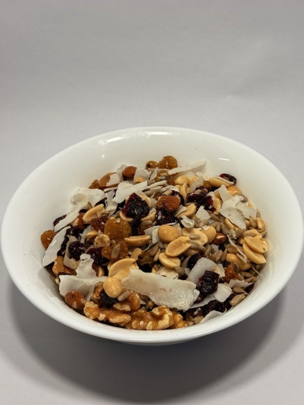 Selección gourmet completa que equilibra la cremosidad de los frutos secos con la frescura ácida de los arándanos y la manzana deshidratada.